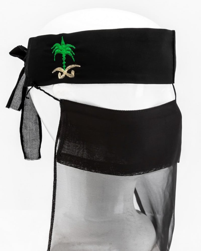 برقع بتصميم تراثي وجميل يعطي مظهر جميل وأنيق عند إرتدائه يأتي باللون الأسود وعلامة سيفين ونخلة ويتدلى منه فالطبقة السفلية قماش شيفون ،فتحة العين واسعة ومناسبة من الأطراف تخرج خيوط لأجل تثبيته على الوجه وتغطيته، يتميز البرقع هذا بتصميم جميل، ويهدف إلى إضفاء لمسة من الأناقة والجاذبية على مظهرك، ويضفي لمسة فريدة ومميزة على مظهرك، مناسب لإطلالتك في الاعياد والمناسبات الوطنية ويوم التأسيس.