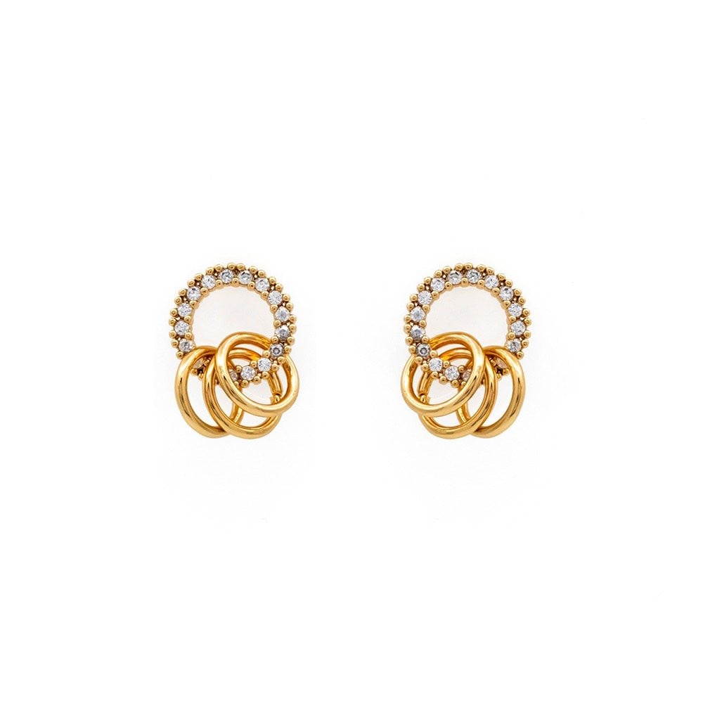 حلق مفرّغ ومُزين بفصوص الزيركون تجتمع مع حلقات ناعمه لتعطي منظراً جذاباً يسحر عيونهم متوفر باللون الذهبي والفضي.