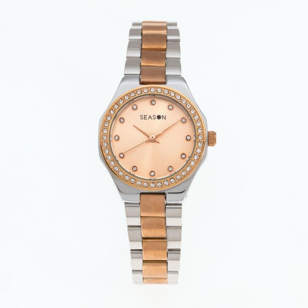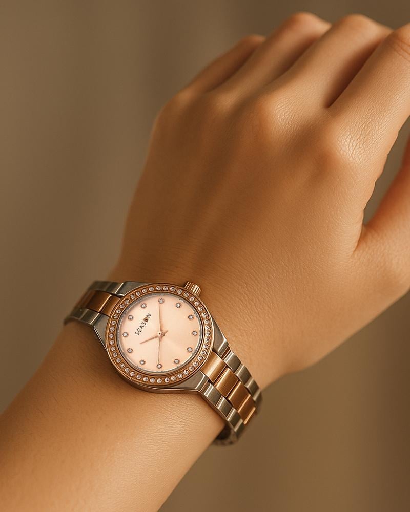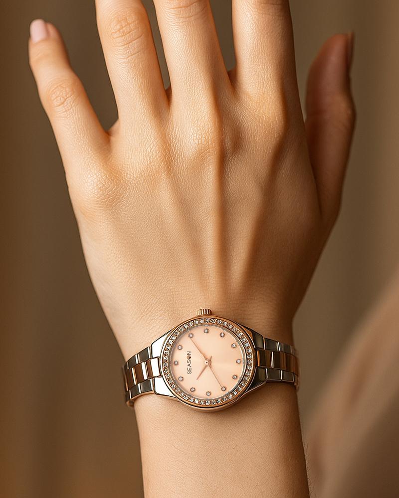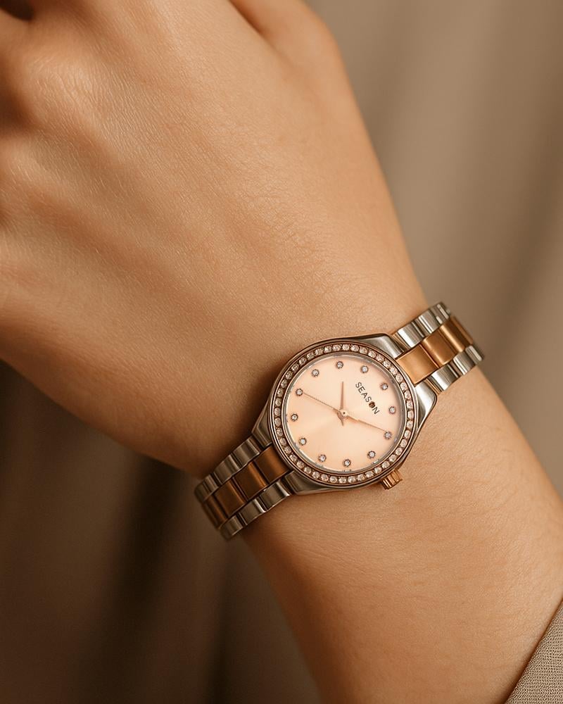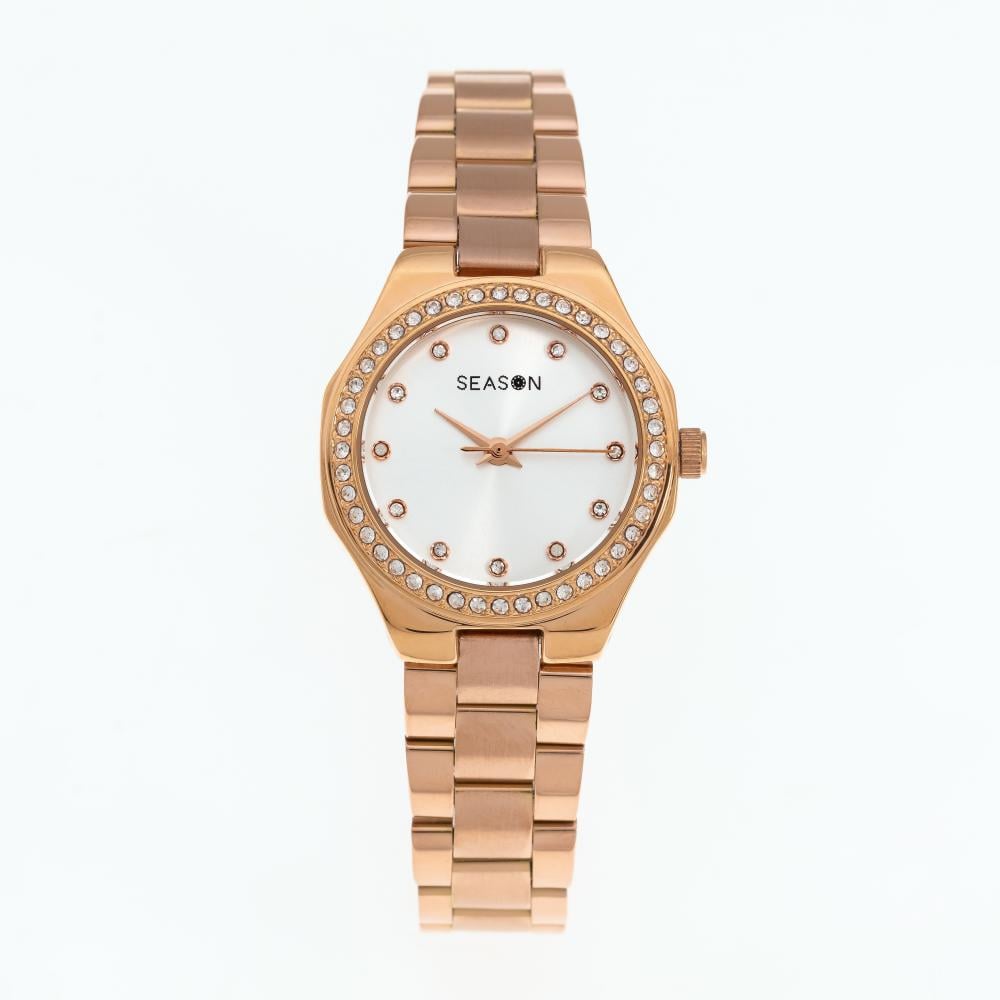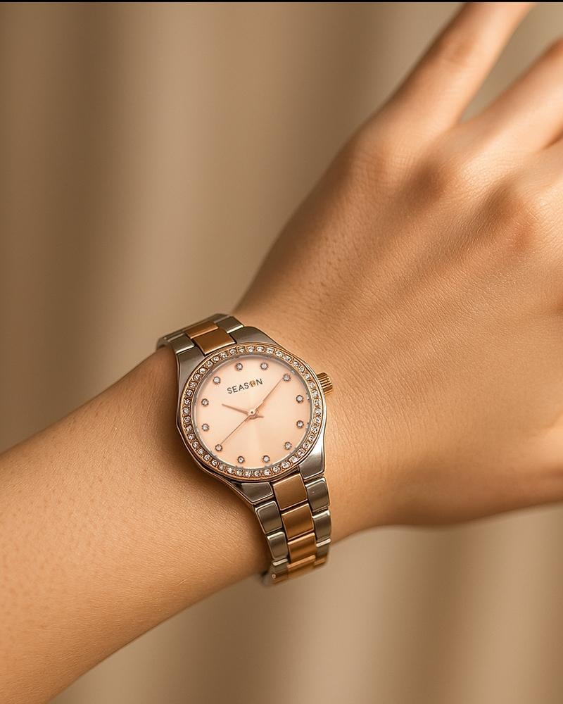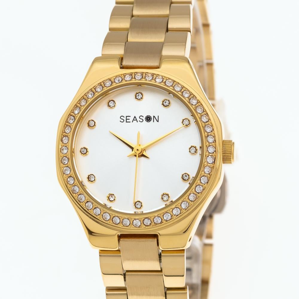 تألقي باجمل اطلالة تجمل معصمك مع هذه الساعه الفاخرة من سيزون بتصميمها الدائري الكلاسيكي والمميز بسوار واطار ذهبي مرصع بالكرستال وميناء ابيض ، والتي تجمع بين الطابع الرسمي والعملي. صُممت لتناسب جميع الأذواق في المناسبات الرسميه والعمليه وفي المناسبات ، سواء كنت في العمل أو في نزهة مع الأصدقاء. تتميز بهيكل متين من خامات عالية الجودة، وآلية حركة دقيقة لضبط الوقت، إضافة إلى مقاومتها للماء لتمنحك حرية الاستخدام في أي ظرف.