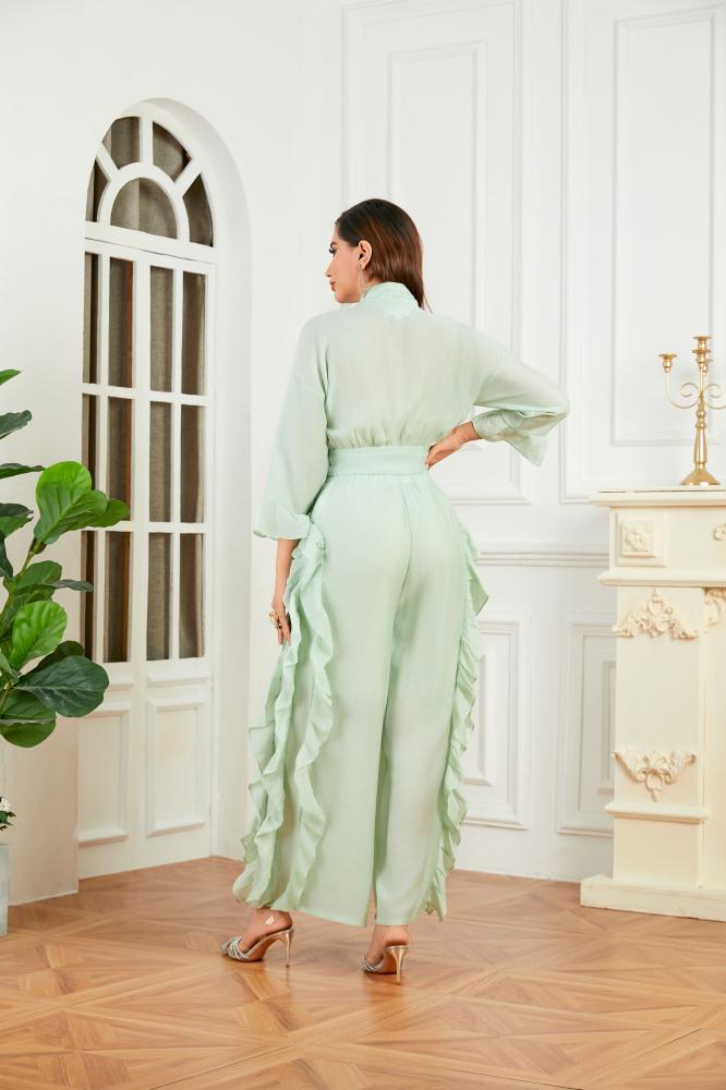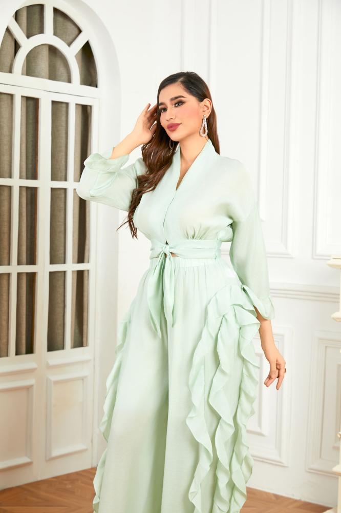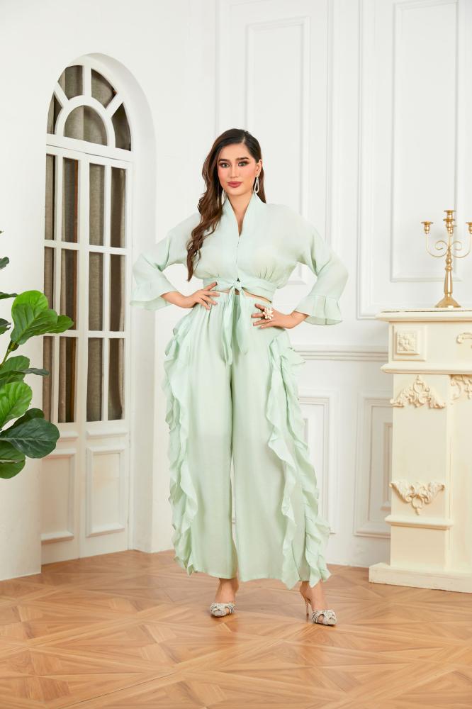 - بنطلون طويل بفتحة أمامية بسحاب: تصميم جريء وعصري يسمح بالتحكم في مقدار الفتحة، مما يضفي لمسة فريدة ويضمن سهولة الحركة.