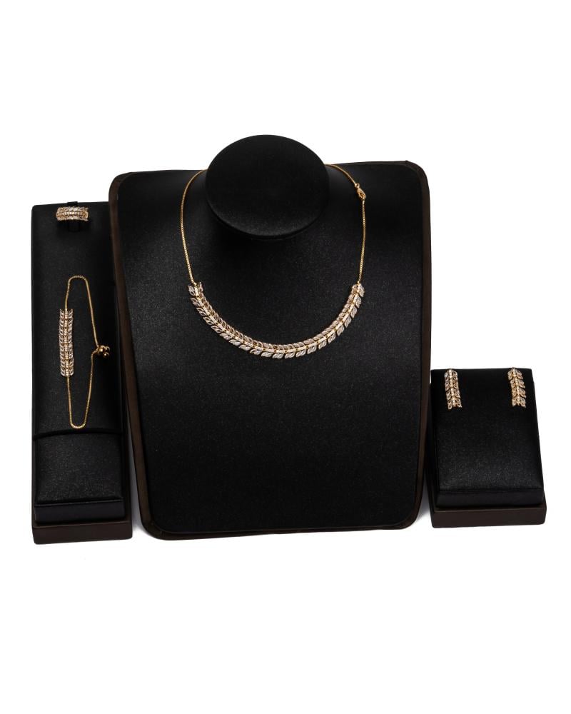 ارتقِ بأسلوبك مع مجموعة المجوهرات المرصعة باحجار الزركون ، المصممة للمرأة العصرية التي تقدر الأناقة الخالدة. تتضمن هذه المجموعة زوجًا من الأقراط وقلادة واسوارة وخاتم ، كل منها مصمم بعناية فائقة بالتفاصيل.