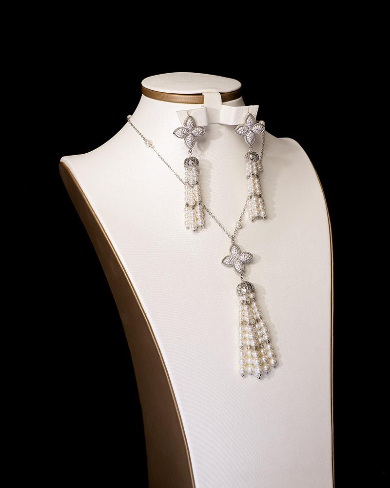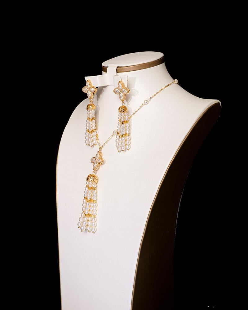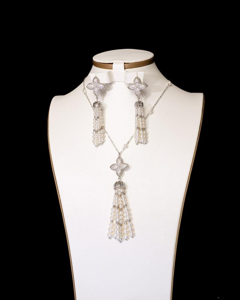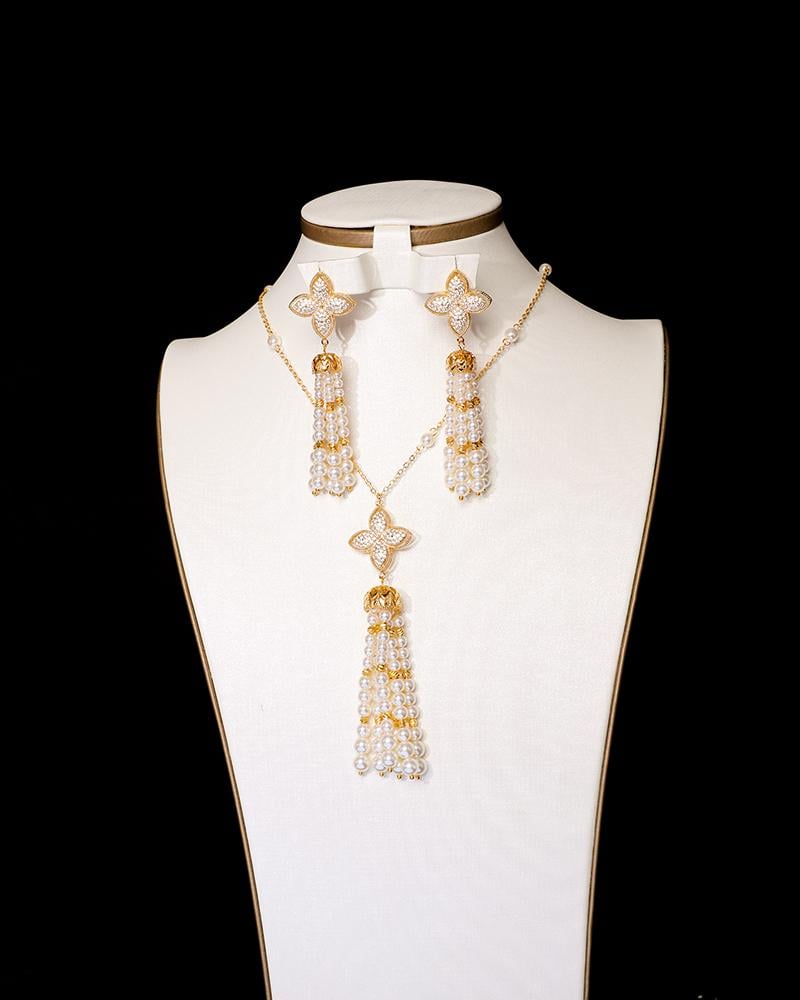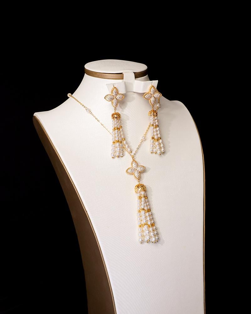 يشمل الطقم : سلسال أنيق، حلق ، مزينة بلمسات اللؤلؤ العريقة ، بتثبيت متقن ولمعان يخطف الأنظار.