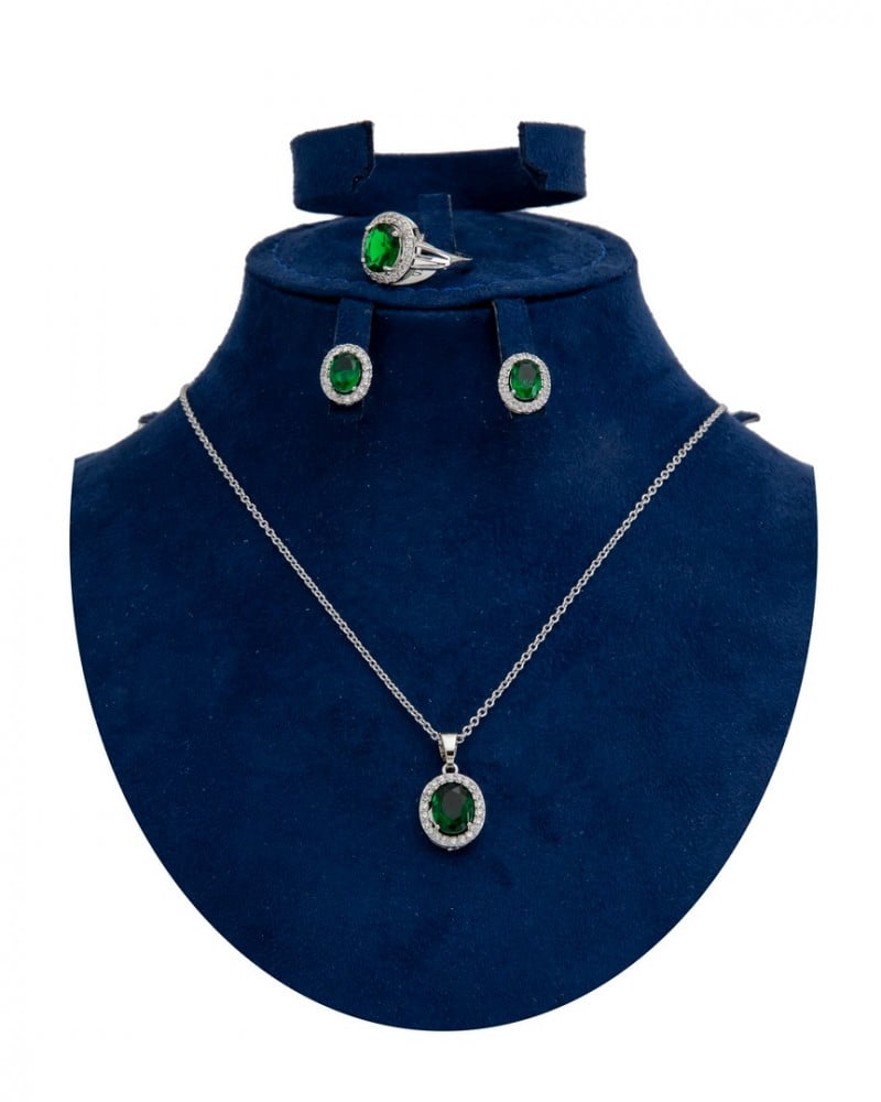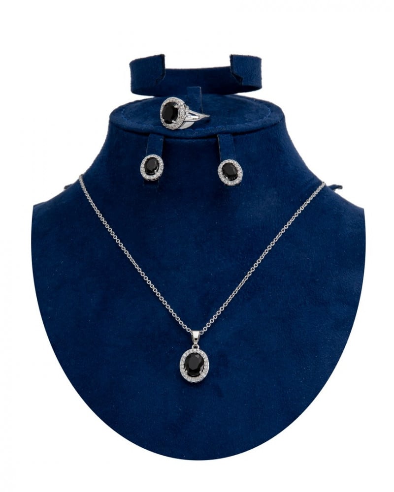 وتشمل هذه المجموعة على سلسلة وزوج من الأقراط المتدلية مع خاتم فاخر.