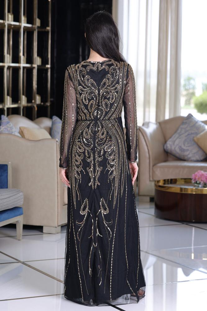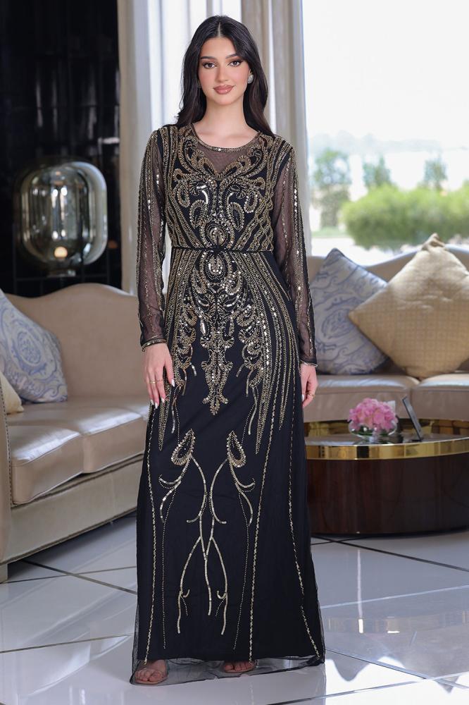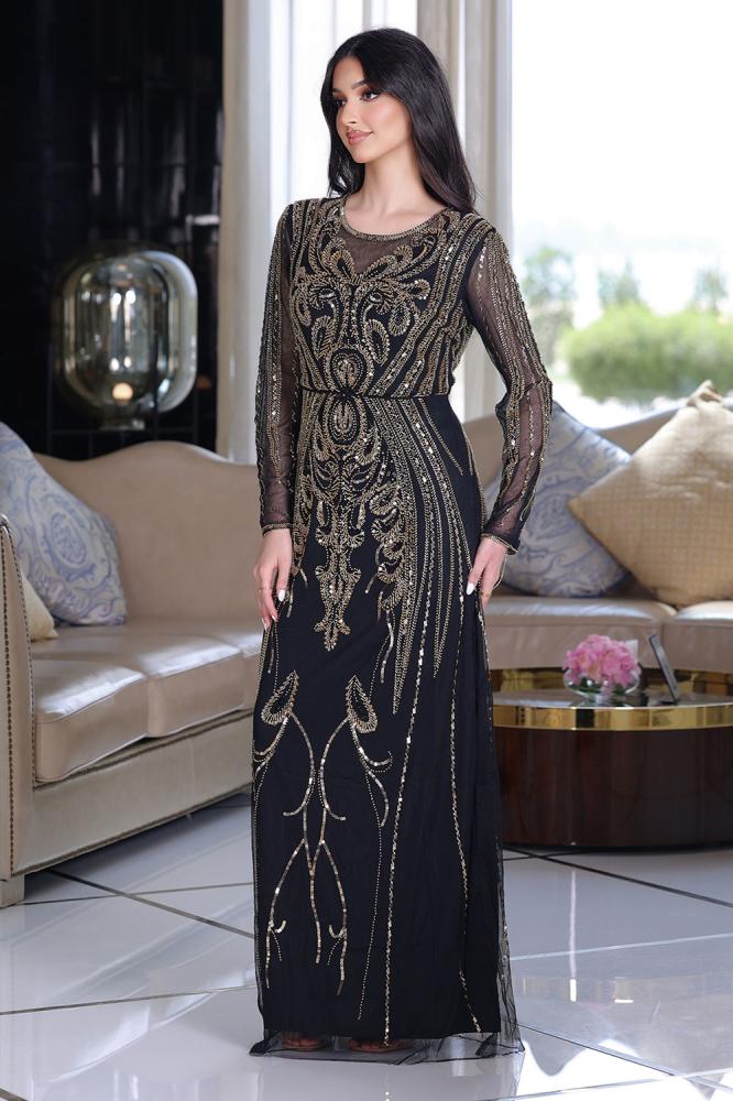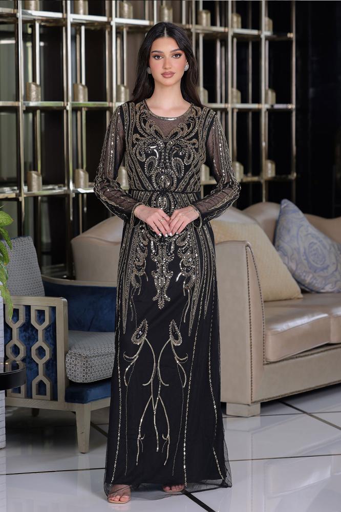 فستان سهرة شيفون اسود مطرز بالذهبي – بتفاصيل اكثر جاذبيه واناقه