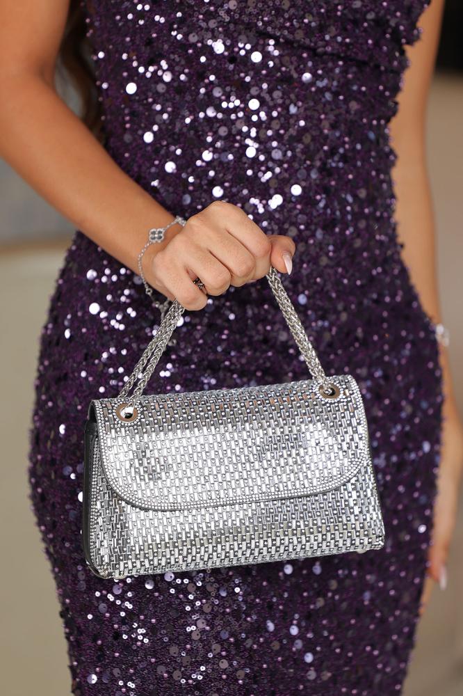 اللمعان على الفستان يعطيه لمسة فخامة بدون ما يكون مبالغ، لونه البنفسجي المميز يخطف الانظار في كل مكان .