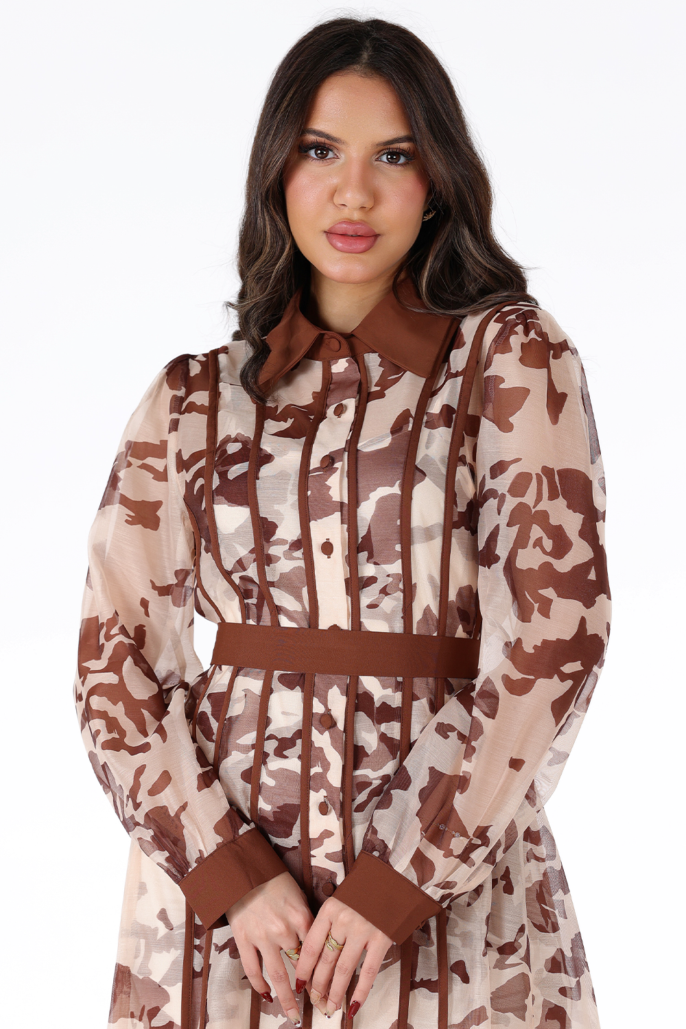 · الأكمام: أكمام طويلة ساترة تنتهي بأساور بنية عريضة تضفي لمسة من الأناقة الرسمية على التصميم الكاجوال.