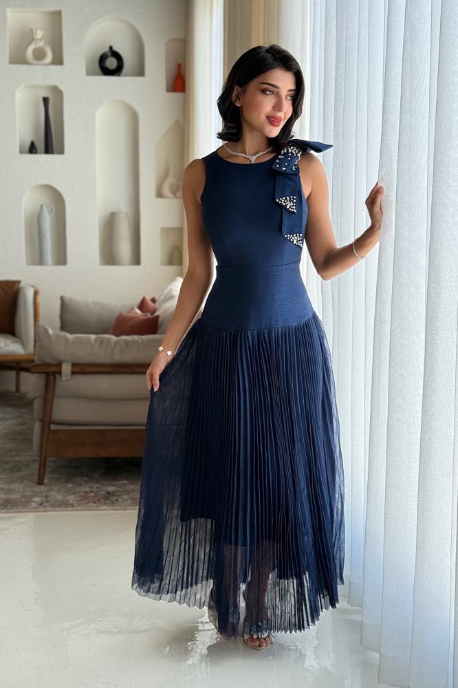 • خصر محدد بحزام عريض: يساعد على إبراز جمال الخصر ومنح الفستان قصة انسيابية وجذابة تحدد القوام.