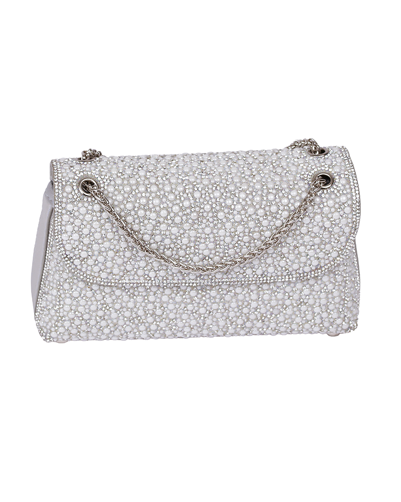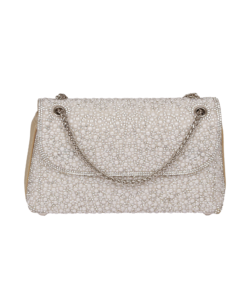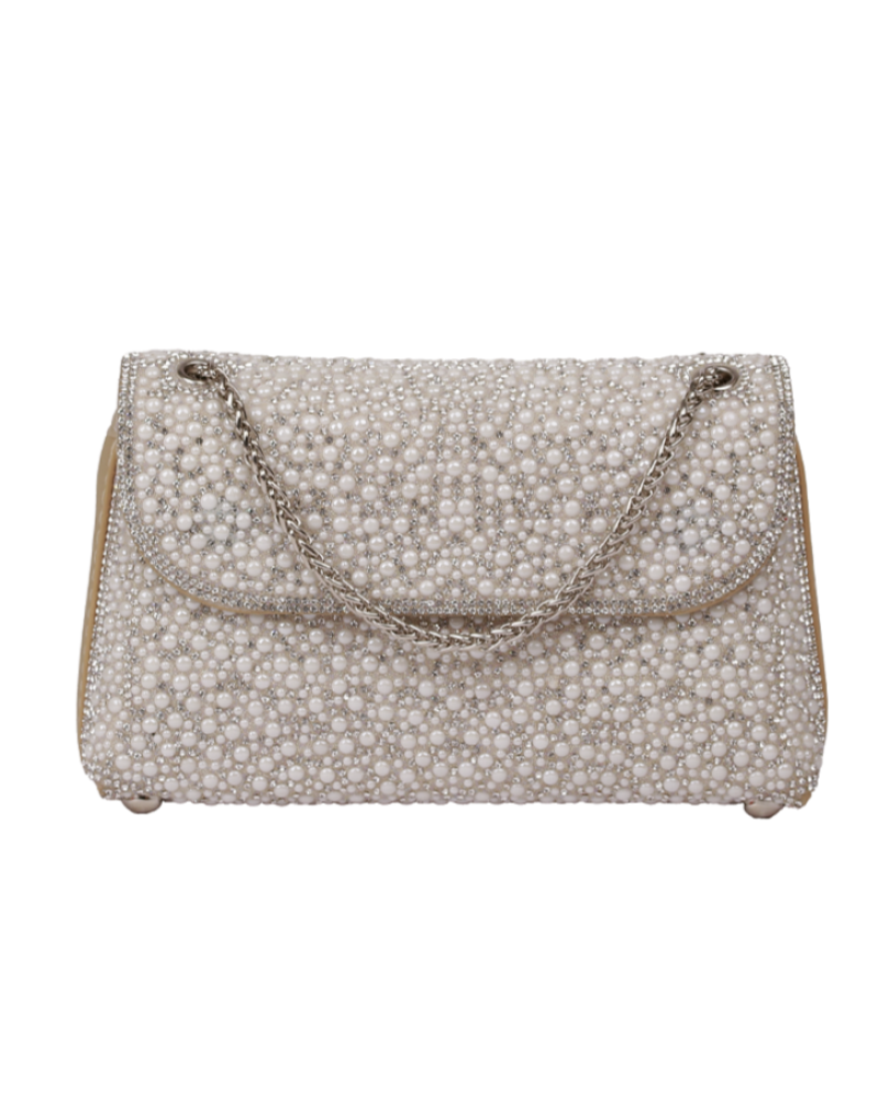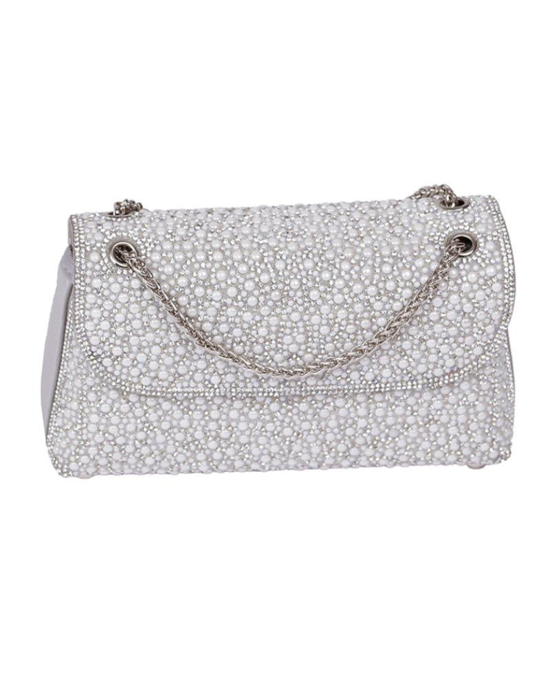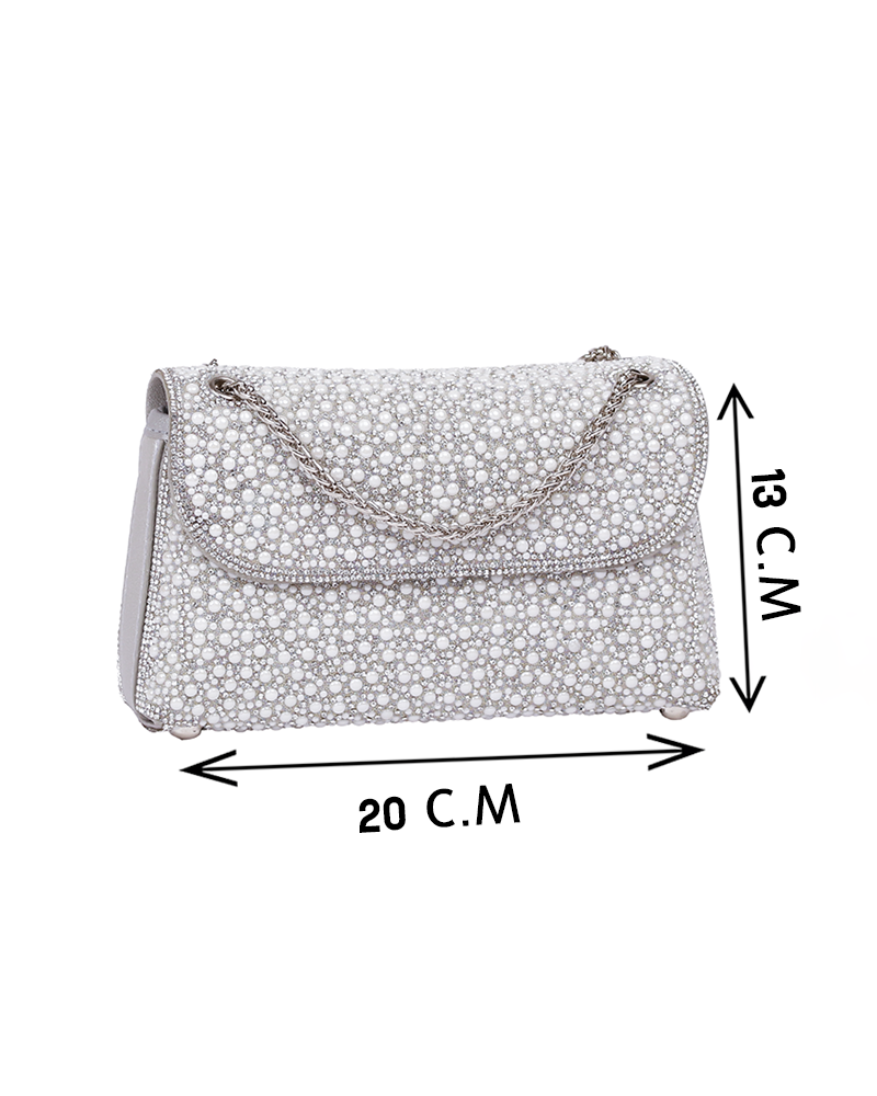 شنطة يد نسائية أنيقة بلمسات اللؤلؤ الانيق والمميز ، تعطيك طابع أنثوي ناعم وفخامة في نفس الوقت وتتميز بستراب مميز وانيق على شكل سلسلة معدنية رقيقة .
