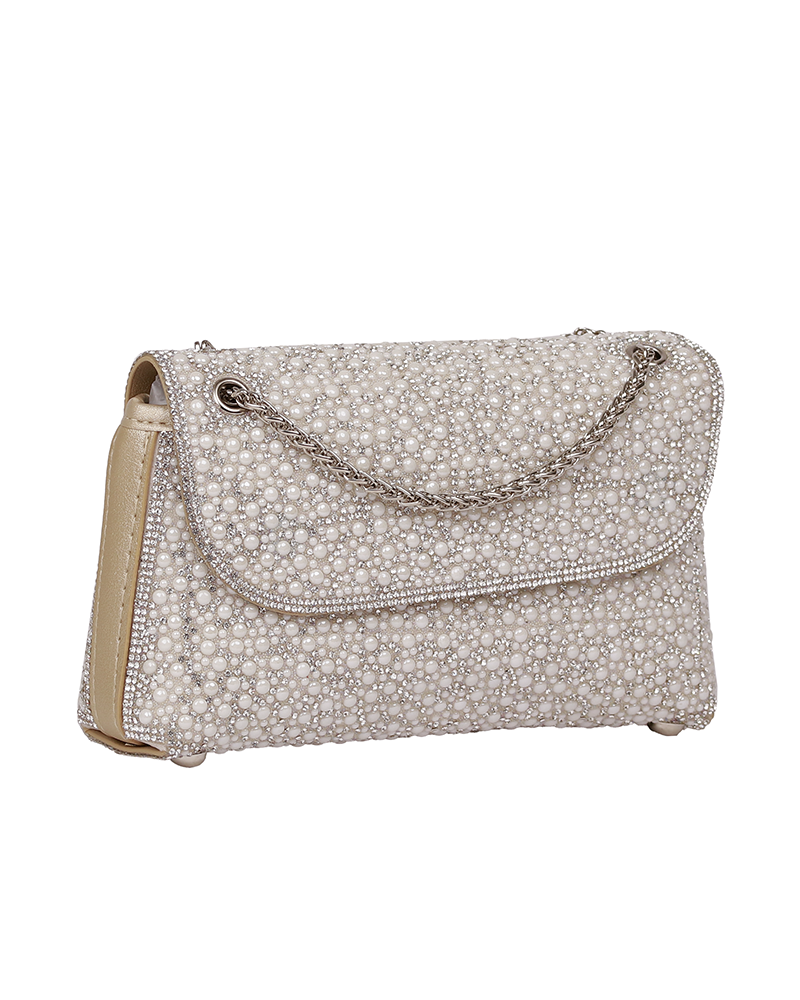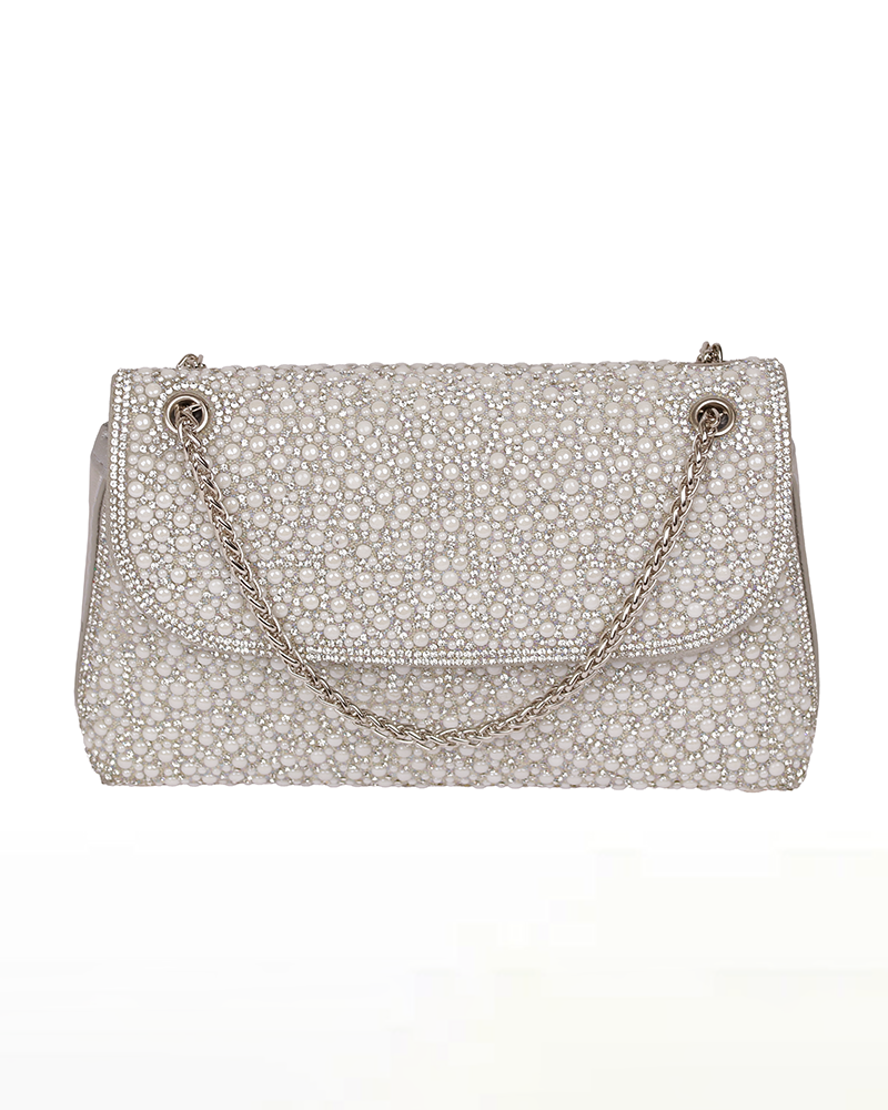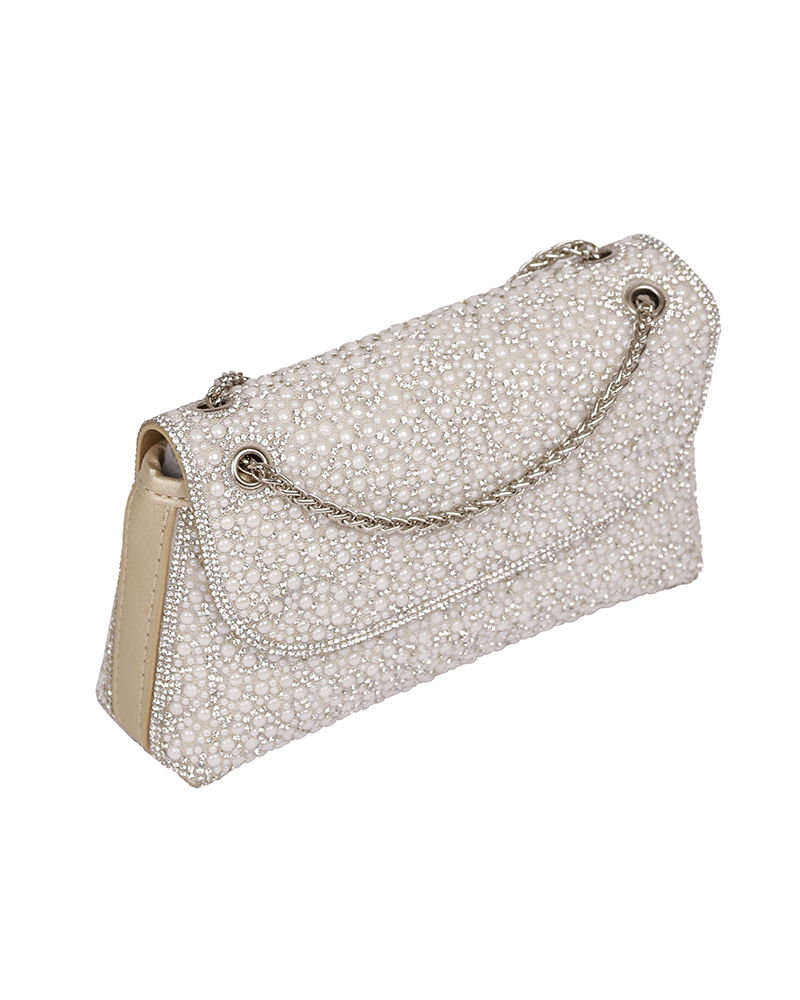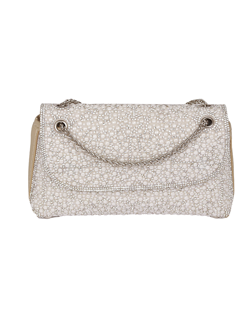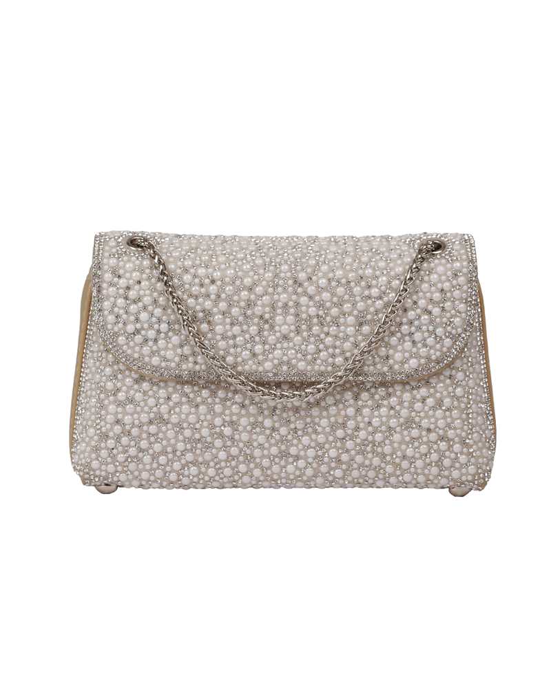 شنطة يد نسائية أنيقة بلمسات اللؤلؤ الانيق والمميز ، تعطيك طابع أنثوي ناعم وفخامة في نفس الوقت وتتميز بستراب مميز وانيق على شكل سلسلة معدنية رقيقة .