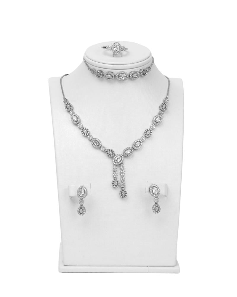 ارتقِ بأسلوبك مع مجموعة المجوهرات المرصعة باحجار الزركون ، المصممة للمرأة العصرية التي تقدر الأناقة الخالدة. تتضمن هذه المجموعة زوجًا من الأقراط وقلادة وخاتم ، كل منها مصمم بعناية فائقة بالتفاصيل.