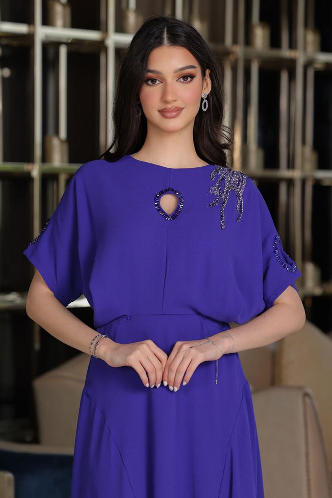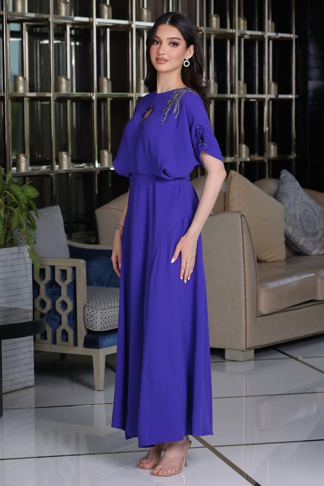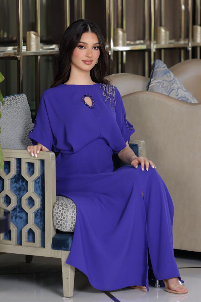 التطريز الخفيف على طرف الكتف يعطيه لمسة فخامة بدون ما يكون مبالغ، ويجي بنصف كم مريح وانيق في نفس الوقت . لونه الأزرق المميز يخطف النظر ويليق بكل درجات البشرة.